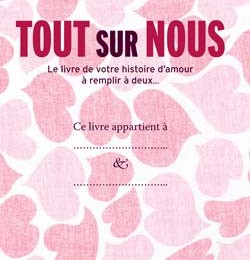 tout sur nousJe suis tombée sur une petite merveille il y a un petit moment déjà. Un jour ou j’étais à la gare et que mon train avait un retard d’annoncé, j’ai pris le temps de me rendre à la Fnac pour voir les nouveautés. C’est alors que j’ai vu un petit livre de poche qui se nomme « TOUT sur NOUS: Le livre de votre histoire d’amour à remplir à deux… » !!! Je ne réfléchis pas deux fois, je le prend pour 6 € seulement et me voilà avec un cadeau pour mon chéri et un futur départ pour une grande et longue aventure. C’est un cadeau pour homme romantique vraiment apprécié et j’en sais quelque chose puisque le mien c’est vraiment pris au jeu!